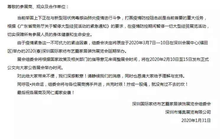 2020(春)深圳國際家紡布藝暨家居裝飾展覽會(huì)原計(jì)劃于3月7-10日在深圳會(huì)展中心舉辦,現(xiàn)已發(fā)布延遲通知,并將在2月10-15日發(fā)布公文公告具體舉辦時(shí)間。