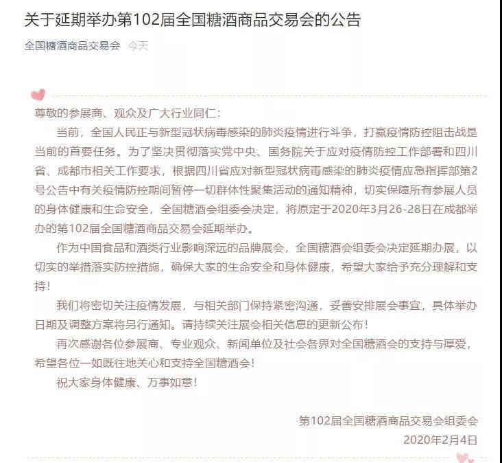 第102屆春季全國糖酒商品交易會(huì)原定于3月26-28日在成都舉辦,現(xiàn)已確定日期延后,具體時(shí)間另行通知。