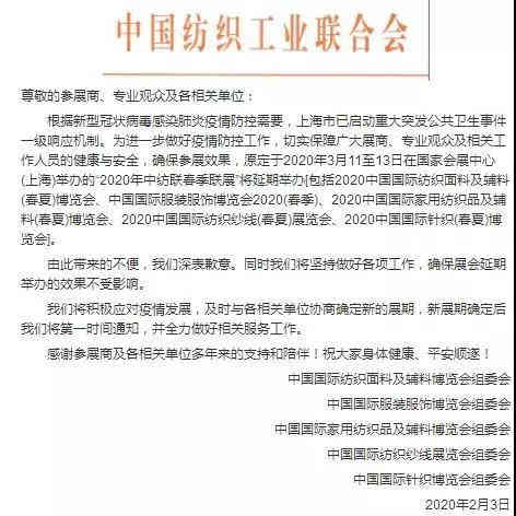 2020年中紡聯(lián)春季聯(lián)展將延期舉辦,原定于3月11-13日在國家會(huì)展中心(上海)舉辦的。