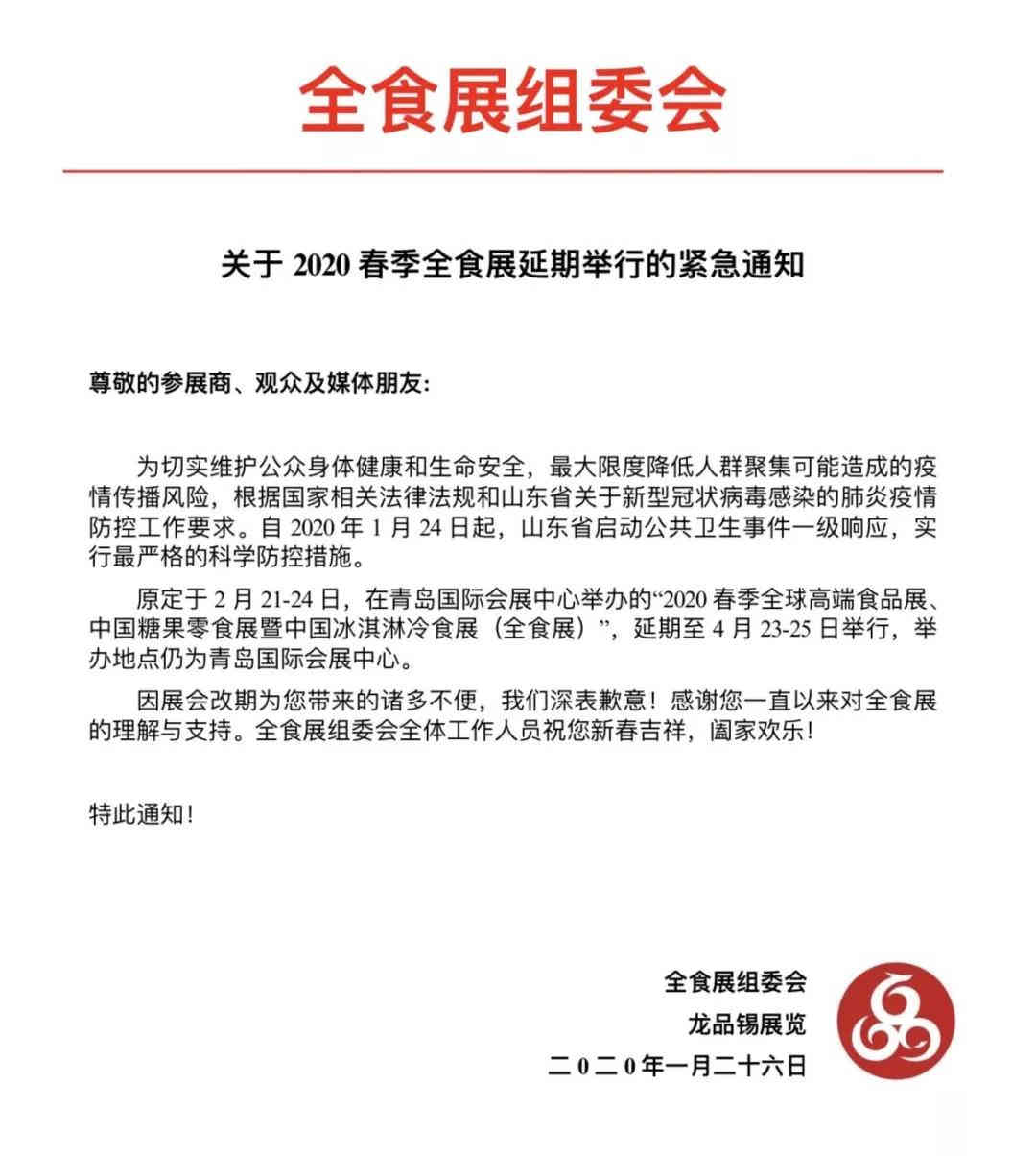 2020春季全球高端食品展、中國糖果零食展暨中國冰淇淋冷食展(簡(jiǎn)稱2020年春季全食展),將原定舉辦時(shí)間2月21-24日,延期至4月23-25日,舉辦地點(diǎn)仍為青島國際會(huì)展中心。